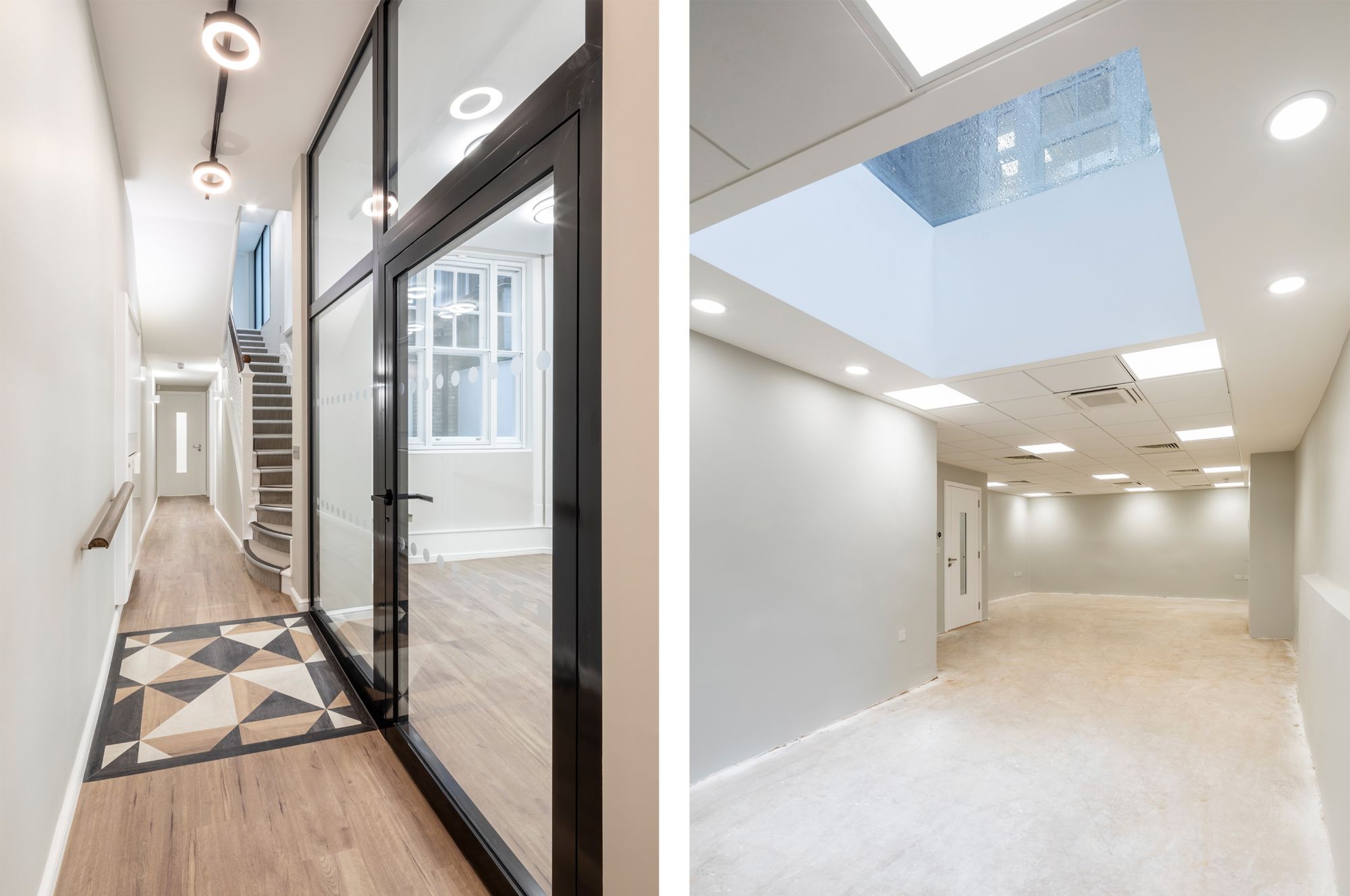 The brief was to maximise a tired asset and upgrade the building for medical use. A new passenger lift provides level access to all floors and new plant provides comfort cooling while removing perimeter radiators. The basement lightwell was infilled and the ground floor extended - both with large roof lights. A new first floor annex with air handling plant above (concealed behind a traditional mansard screen) was constructed to serve the rear of the building. The top two floors previously housed a maisonette which was part of a use-swap elsewhere on the estate. This also meant a new stair had to be built to avoid clashing with the new lift. A compact, but very usable building ready for a tenant!